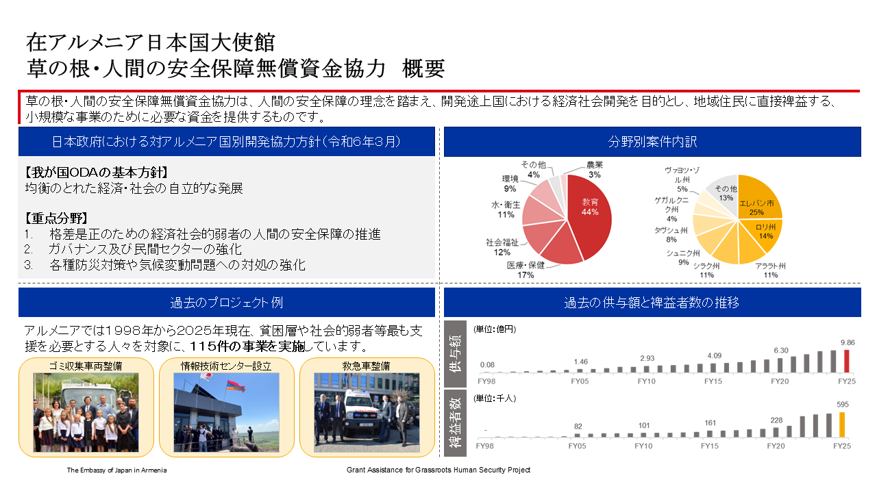 アルメニアでは1998年以来、貧困層や社会的弱者など最も支援を必要とする人々を対象に、教育、医療保健、民生環境といった分野を通じて115件のプロジェクト、金額にして総額約9億8千万円を支援して参りました。本スキームは、開発途上国の草の根レベルに直接裨益するきめ細かい援助として、各方面から高い評価を得ており、当館は今後一層アルメニアにおける草の根無償事業に注力していく予定です。